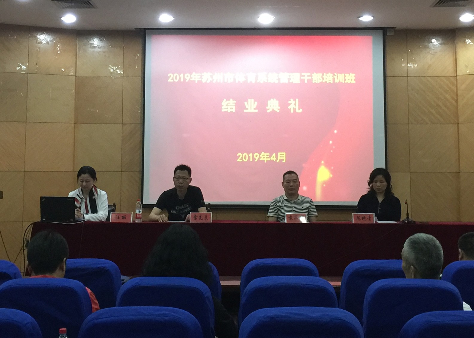 4月26日上午,2019年苏州市体育系统管理干部第二期培训班结业典礼在东教学楼第二学术报告厅举行。苏州市体育局调研员袁永球、副局长陈艳青、武汉体育学院继续教育学院培训部主任雷先良等出席此次结业典礼。结业典礼由苏州市体育局组织人事处副处长汪丽主持。